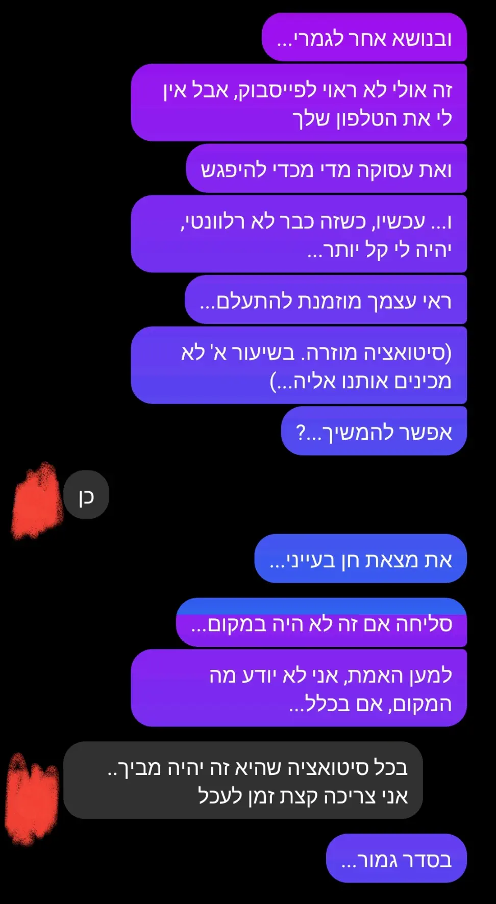 הודעות במהלך היום, גם הבעת חיבה רגשות ומחשבות וגם שיתוף -נתקלתי בסרטון\ פוסט הזה וחשבתי עלייך (משהו שמביע אהבה, הערכה או תשוקה)