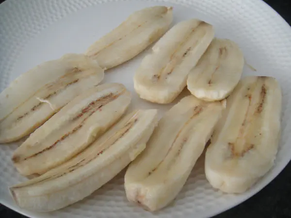 אפשר לחתוך בננה לשלישים (לאורך) ממש בקלות עם הידיים. עם ידיים נקיות, דוחפים קצת את האצבע פנימה בקצה של הבננה באמצע -והבננה מתחלקת מעצמה לשלושה "פלחים".