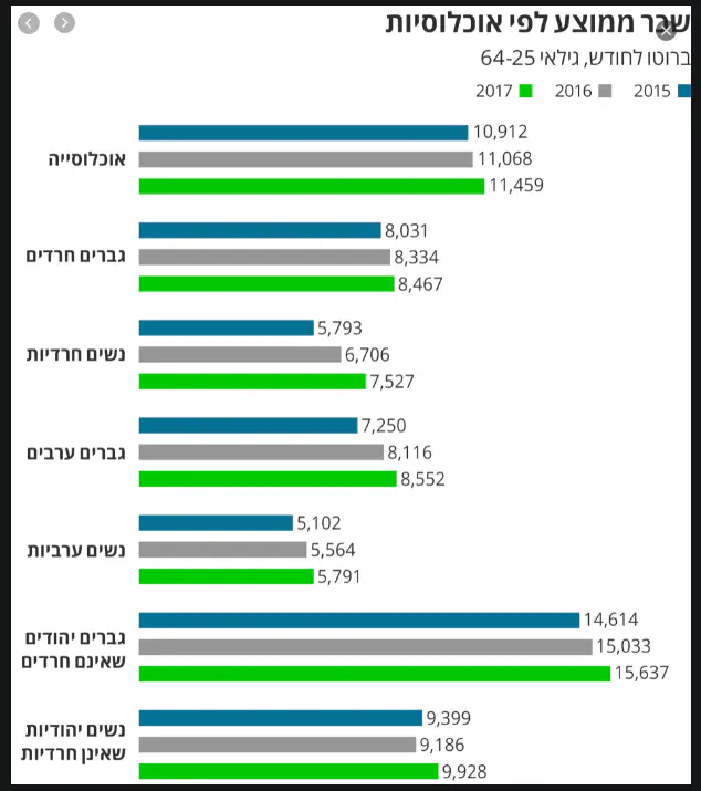 ניתן לראות שמבגזר הכללי חמשת העשירונים העליונים בחישוב כללי תורמים כספית למדינה יותר משלוקחים ממנה, כאשר העשירון העליון תורם כ18,000 שח לחודש, ואילו ארבעת העשירונים הנמוכים עולים למדינה אלפי שקלים מדי חודש.