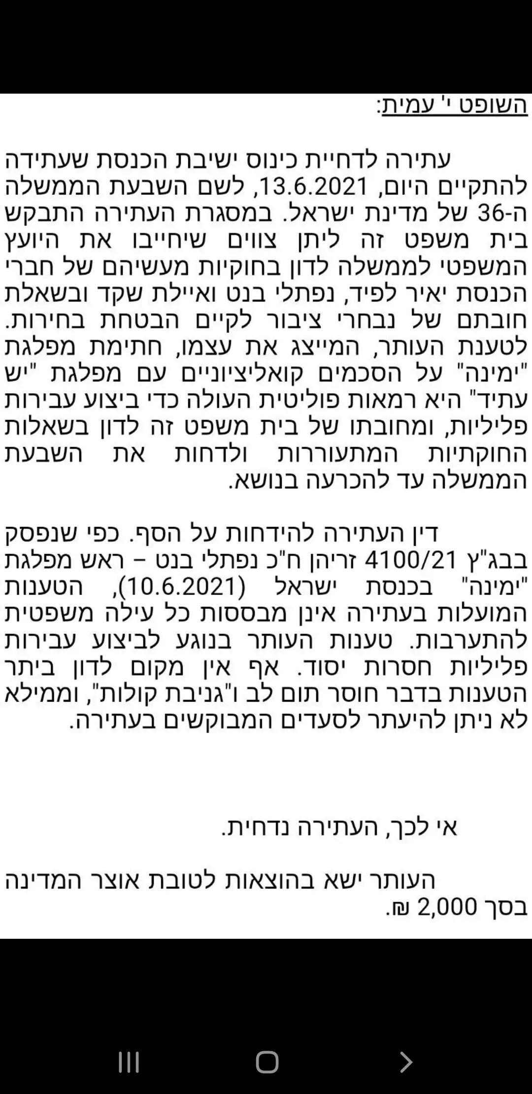 אולי בנט יוכל לומר להגנתו שהוא מעדיף ממשלת ימין אבל לא על בחירות חוזרות כפי שאמר שימנע, אני חושב שיש בטענה הזאת משהו, אבל עדיין אני לא בטוח שזה גובר על בגידה בשני הסעיפים הללו, וגם אני לא בטוח שהוא טען זאת גם אחרי שחתם, הרי ביבי ניסה לדחוק אותו לפינה ומזמן מסוים זכור לי שהוא הכחיש אפשרות שכזאת. רק בהתחלה הוא היתבטא באופן שאכן היה אפשר להבין זאת ממנו כך. אני לא בטוח שזה היה אחרי החתימה. ועדיין צריך לבדוק את הדברים ברמה ההיסטורית.