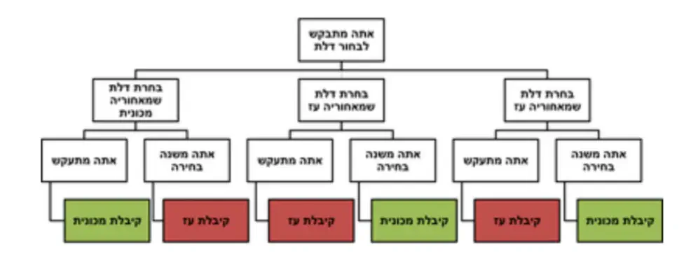 והמנחה שואל את המשתתף האם הוא רוצה להחליף את הבחירה שלו לדלת שנותרה או להשאר עם הבחירה שלו.