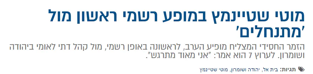 אפשר אולי לא להתלהב מזה שמוטי שטיינמץ עבר את הקו הירוק, וזה כי אין הרבה משמעות מבחינתי לא למוטי שטיינמץ ולא לקו הירוק. ולכן אני לא הייתי מעלה כתבה כזאת. אבל הניסוח התנחלות הוא לגיטימי לחלוטין