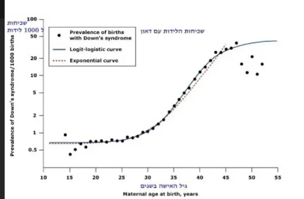 בטבלה הזו רואים שעד גיל 30 כמעט ואין סיכון, ומאז זה מתחיל לעלות בהדרגה. אין גבול ברור שממנו זה פתאום סיכון גדול, אבל כל שנה מוסיפה לסיכון (כדאי לשים לב שזה לא באחוזים, אלא למספר לידות מתוך 1000 לידות, אז צריך לחלק ב-10 כדי שזה יהיה באחוזים). אז בגיל 35 הסיכון כבר גדול מאשר בגיל 30, ובגיל 40 כבר זה כבר קרוב ל1%.