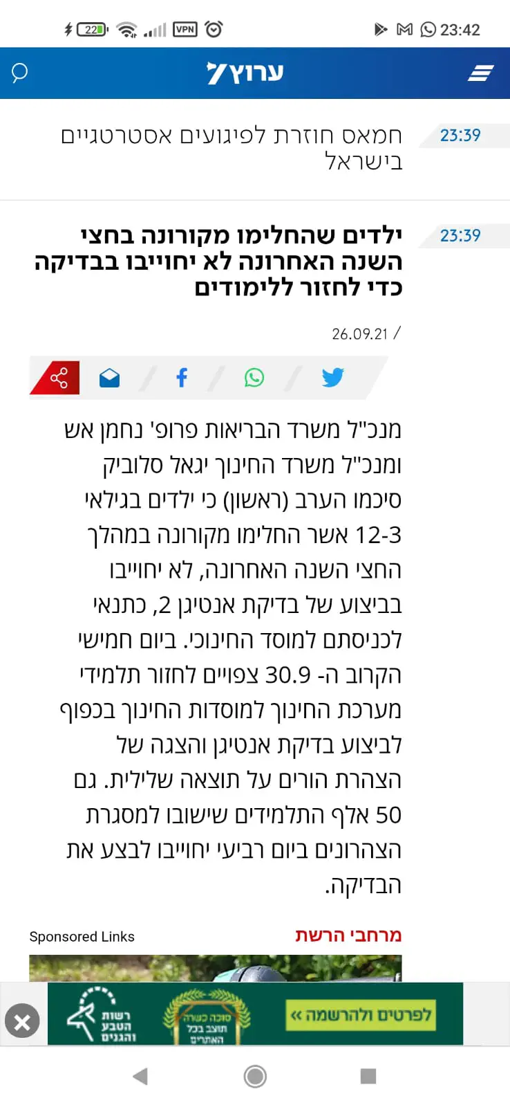 מנכ"ל משרד הבריאות, פרופ' נחמן אש ומנכ"ל משרד החינוך, תא"ל (במיל') יגאל סלוביק, סיכמו הערב (א'), כי ילדים בגילאי 12-3 אשר החלימו מקורונה במהלך החצי השנה האחרונה, לא יחוייבו בביצוע של בדיקת אנטיגן 2, כתנאי לכניסתם למוסד החינוכי.