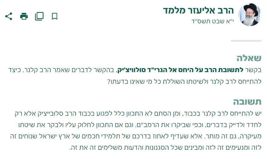 מגוחך ואירוני שבשם ההגנה על "כבוד ת"ח" אתם מכשירים ביזיון עצום של ת"ח. כדי לעצום עינים ולא להסתבך עם "כבוד הרב קלנר" מחקתם את "כבוד הרב סולובייצ'יק" שלא ספק לא ראה אותו ממטר בכלל.