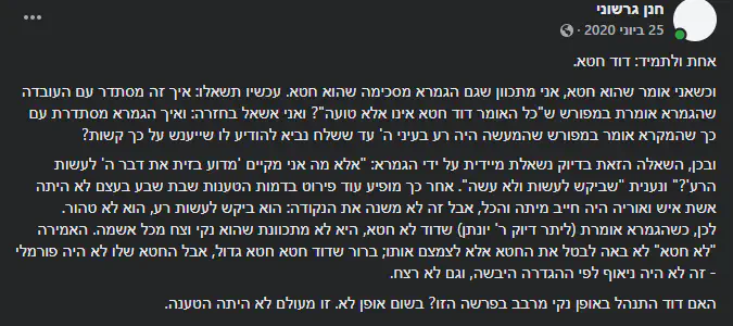 צדיק אמת, לא אחד שהולך ועושה מה שבא לו, הקב"ה אחרי החטא דיבר עם קין. כתוב "כל האומר דוד המלך חטא אינו אלא טועה". הירושלמי מוסיף אם אני זוכר נכון "אינו אלא חוטא". למה בא נגיד שדוד המלך באמת חטא הרי הא היה בן אדם, כולנו בני אדם. ואז מסבירים הפרשנים כל מיני הסברים שדוחקים לך את סיפור המעשה, שחיילות בית דוד היו נותנים גט על תנאי וכו'.