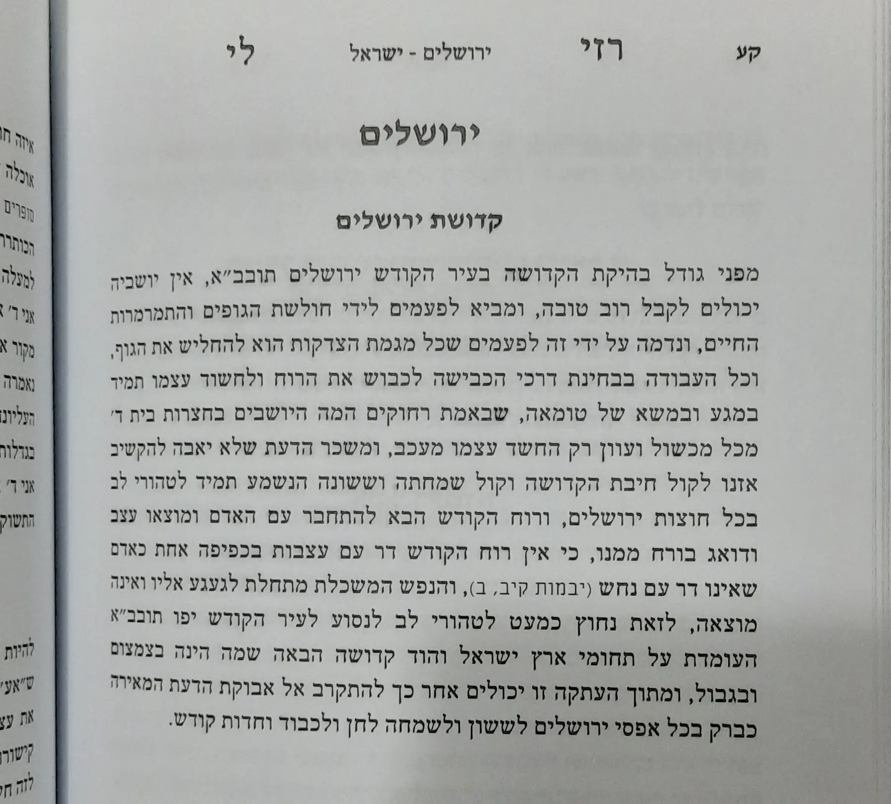 אז הוא אומר שנחוץ כמעט לטהורי לב מעיה"ק ירושלים, לנסוע מידי פעם לנשום את אווירה של יפו עיר המושבות ת"ו, שקדושתה פחותה יותר ושהיא על גבולות הארץ, וע"י שמגיעים לשם אפשר קצת להירגע ולשמוח במדרגה שכן השיגו.