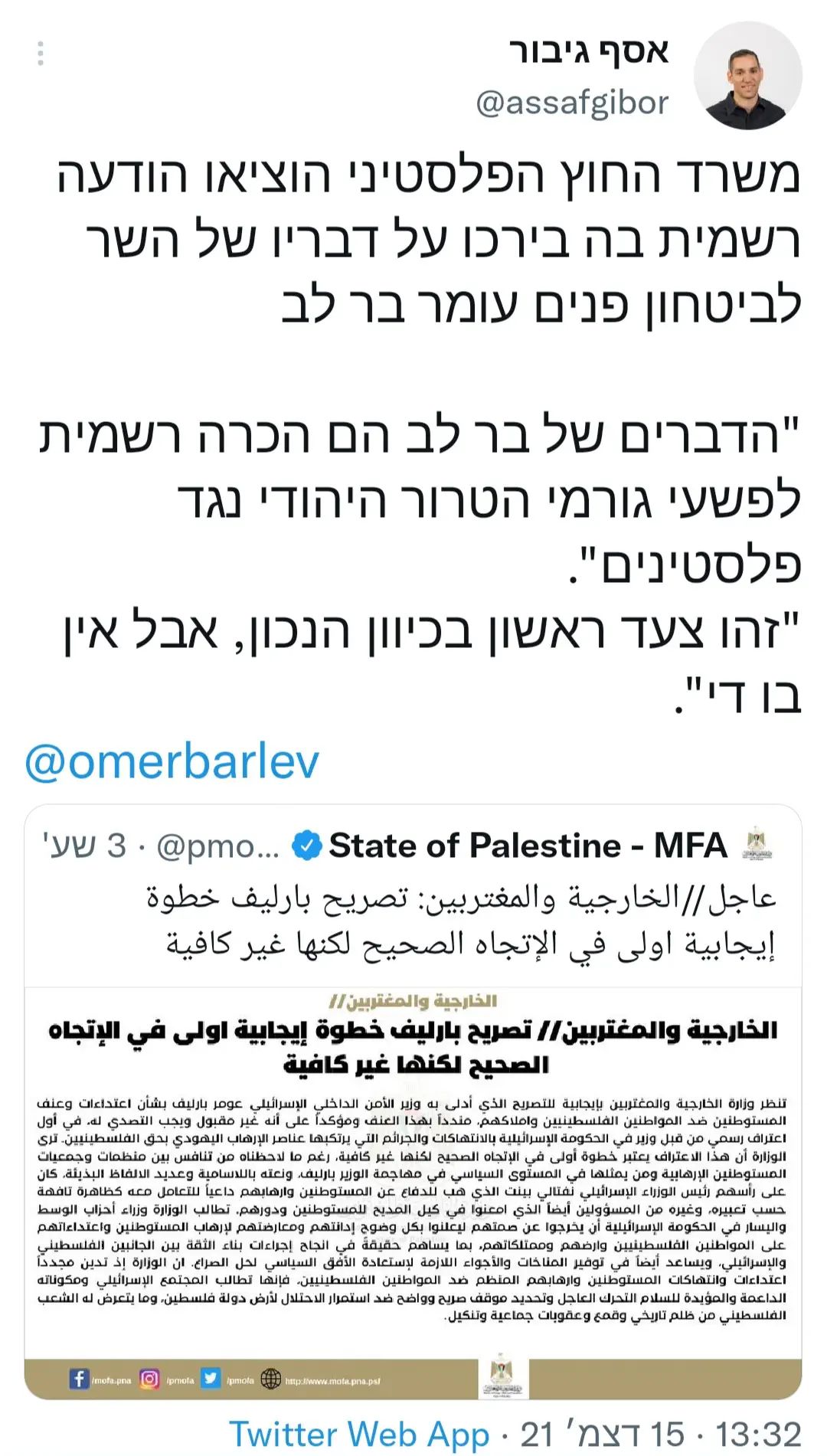 כעת אני חוזר למקום שבו אני השתלבתי בשרשור והוא הנזק התדמיתי שגרם בר לב למדינת ישראל. כאשר הרשות הפלסטינית מדבר על אלימות מתנחלים, וכאשר השר הממונה מדבר אף הוא עם בכירה בממשל ארה"ב על כך, יוצא מכך שקורה פיגוע רצחני אז מתייחסים לכך בעולם כמשהו לכל הפחות סימטרי, אם לא כתגובה לאלימות של המתנחלים. וזו בעיה חמורה.