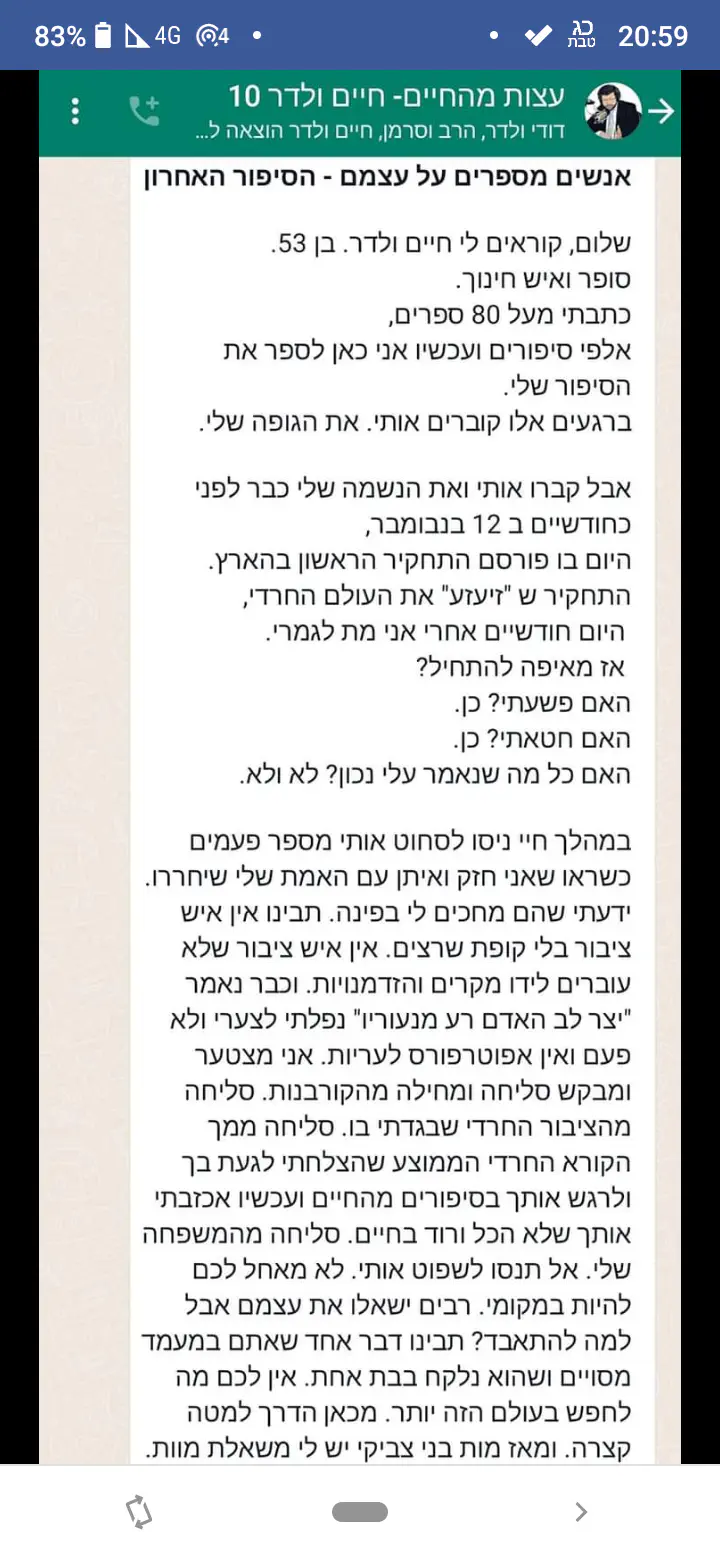 קבעתי עם כל בתי גדולי הרבנים – משני המחנות - שיחה ארוכה על הנושא. הם הזמינו אותי באופן מיוחד. אולי, אולי אוכל להיות שם לעזר גדול. אולי תצמח ישועה כלשהי משם אם מישהו יבהיר להם את הדברים בלי גינונים אלא: למען ה' תעשו משהו.