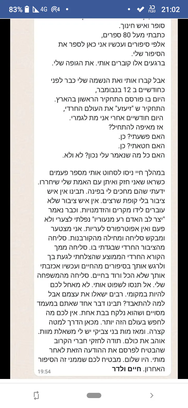 כמו כולם, עוברת עליי טלטלה אישית קשה מאוד מאז התאבדותו של חיים ולדר. הסיפור הזה הוא מיני סרט אימה.