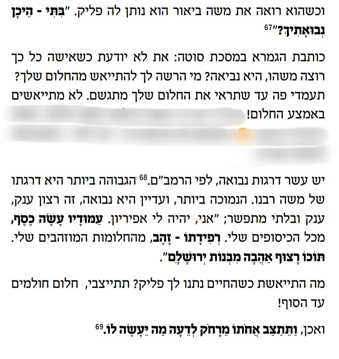 ועל כן, כשמידת הדין מקטרג על מי שֶׁאֵינוֹ רָאוּי לְהִתְקָרֵב לְהַשֵּׁם יִתְבָּרַך לִבְלִי לְהַנִּיחוֹ לִכְנס לְדֶרֶך הַחַיִּים, לְהִתְקָרֵב לְצַדִּיק הָאֱמֶת וּלְדֶרֶך הָאֱמֶת וְהַשֵּׁם יִתְבָּרַך הוּא אוֹהֵב מִשְׁפָּט עַל כֵּן הוּא יִתְבָּרַך מֻכְרָח כִּבְיָכוֹל לְהַסְכִּים לְהַזְמִין לוֹ מְנִיעוֹת לְמוֹנְעוֹ מִדֶּרֶך הַחַיִּים כְּפִי הָרָאוּי לוֹ לְפִי מַעֲשָׂיו הָרָעִים, עַל פִּי הַדִּין וְהַמִּשְׁפָּט כִּי הוּא יִתְבָּרַך אֵינוֹ יָכוֹל לִדְחוֹת אֶת הַדִּין כִּי הוּא יִתְבָּרַך אוֹהֵב מִשְׁפָּט כַּנַּ"ל אַך מֵאַחַר שֶׁבֶּאֱמֶת הוּא יִתְבָּרַך אוֹהֵב יִשְׂרָאֵל וְאוֹתָהּ הָאַהֲבָה שֶׁל יִשְׂרָאֵל הִיא גְּדוֹלָה יוֹתֵר מֵהָאַהֲבָה שֶׁל הַמִּשְׁפָּט כַּנַּ"ל מָה עוֹשֶׂה הַשֵּׁם יִתְבָּרַך כִּי הוּא מֻכְרָח כִּבְיָכוֹל לְהַסְכִּים עַל הַמְּנִיעוֹת לְמָנְעוֹ מִן הָאֱמֶת מֵחֲמַת הַדִּין וְהַמִּשְׁפָּט שֶׁעָלָיו, כִּי הוּא אוֹהֵב מִשְׁפָּט כַּנַּ"ל אֲבָל אַף עַל פִּי כֵן בָּאֱמֶת לַאֲמִתּוֹ רְצוֹנוֹ וְחֶפְצוֹ יִתְבָּרַך, שֶׁאַף עַל פִּי כֵן יִתְקָרֵב הָאָדָם אֵלָיו יִתְבָּרַך כִּי הוּא אוֹהֵב יִשְׂרָאֵל יוֹתֵר מֵהַמִּשְׁפָּט כַּנַּ"ל עַל כֵּן, הַשֵּׁם יִתְבָּרַך נוֹתֵן רְשׁוּת לְהַזְמִין לוֹ מְנִיעוֹת אֲבָל הוּא יִתְבָּרַך בְּעַצְמוֹ מַסְתִּיר אֶת עַצְמוֹ כִּבְיָכוֹל בְּתוֹך הַמְּנִיעוֹת וּ מִי שֶׁהוּא בַּר דַּעַת יָכוֹל לִמְצא אֶת הַשֵּׁם יִתְבָּרַך בְּתוֹך הַמְּנִיעוֹת בְּעַצְמָן כִּי בֶּאֱמֶת אֵין שׁוּם מְנִיעָה בָּעוֹלָם כְּלָל כִּי בְּתֹקֶף הַמְּנִיעוֹת בְּעַצְמָן נִסְתָּר הַשֵּׁם יִתְבָּרַך וְ עַל יְדֵי הַמְּנִיעוֹת בְּעַצְמָן דַּיְקָא יְכוֹלִין לְהִתְקָרֵב לְהַשֵּׁם יִתְבָּרַך כִּי שָׁם נִסְתָּר הוּא יִתְבָּרַך כַּנַּ"ל וּמשֶׁה נִגַּשׁ אֶל הָעֲרָפֶל, שֶׁהוּא הַמְּנִיעָה כִּי שָׁם הָאֱלקִים כַּנַּ"ל
