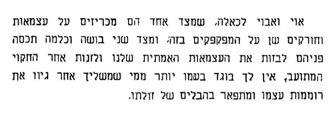 וכמה שזכינו לדבר את שיחות החולין שלנו בלשון שבה ניתנה תורה, ושבה נברא העולם, ושאותה מדברים המלאכים, ושבכל צורת אות בה נתלו כ"כ הרבה דברי תורה, ושבמשך כל הדורות יהודים נזהרו בקדושתה כ"כ. ולצערנו אנחנו קצת התחספסנו...