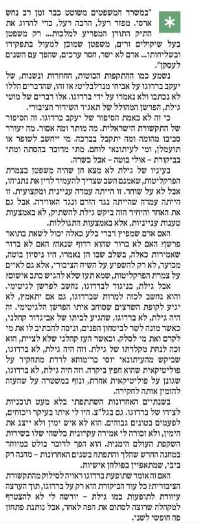 את כתב האישום שהאשים ברדוגו בדבריו הבוקר בתחנה, צריך לשמוע כל אדם שהדמוקרטיה חשובה לו. לא צריך להסכים עם דעותיו ודבריו בתחנה בכדי להבין שנעשה פה מעשה פוליטי אסור, וטוב עשה שהתפטר מהתחנה.