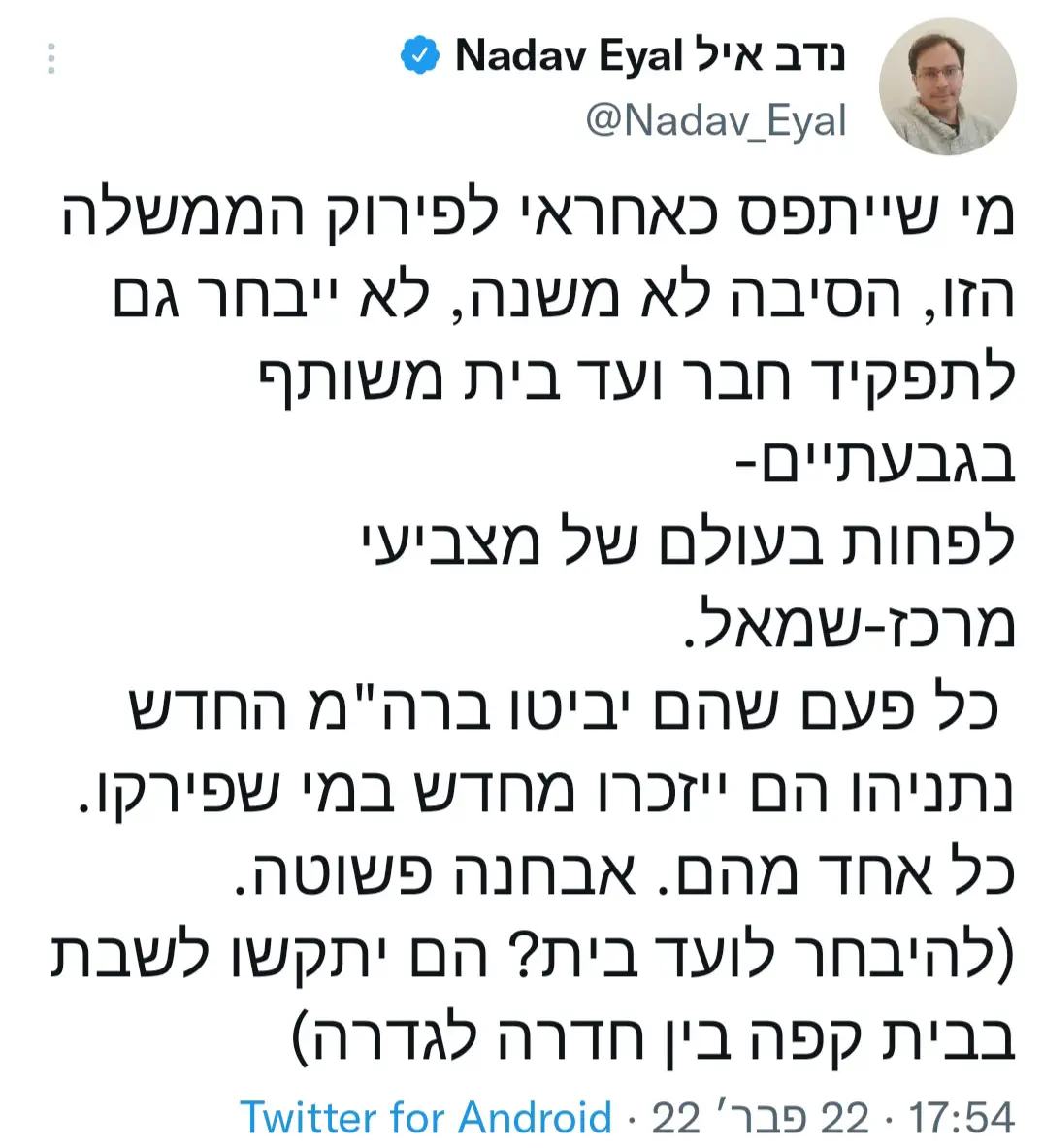מאז המציאות הפוליטית עברה טלטלות שהמציאות בהן עלתה על כל דמיון - שלוש מערכות רצופות, שתי ממשלות פרטיטיות שלא משלימות את ימיהן ומה לא...