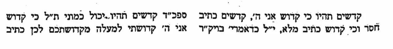 דַּבֵּ֞ר אֶל־כָּל־עֲדַ֧ת בְּנֵי־יִשְׂרָאֵ֛ל וְאָמַרְתָּ֥ אֲלֵהֶ֖ם קְדֹשִׁ֣ים תִּהְי֑וּ כִּ֣י קָד֔וֹשׁ אֲנִ֖י יְהוָ֥ה אֱלֹהֵיכֶֽם: (ויקרא פרק יט פסוק ב)