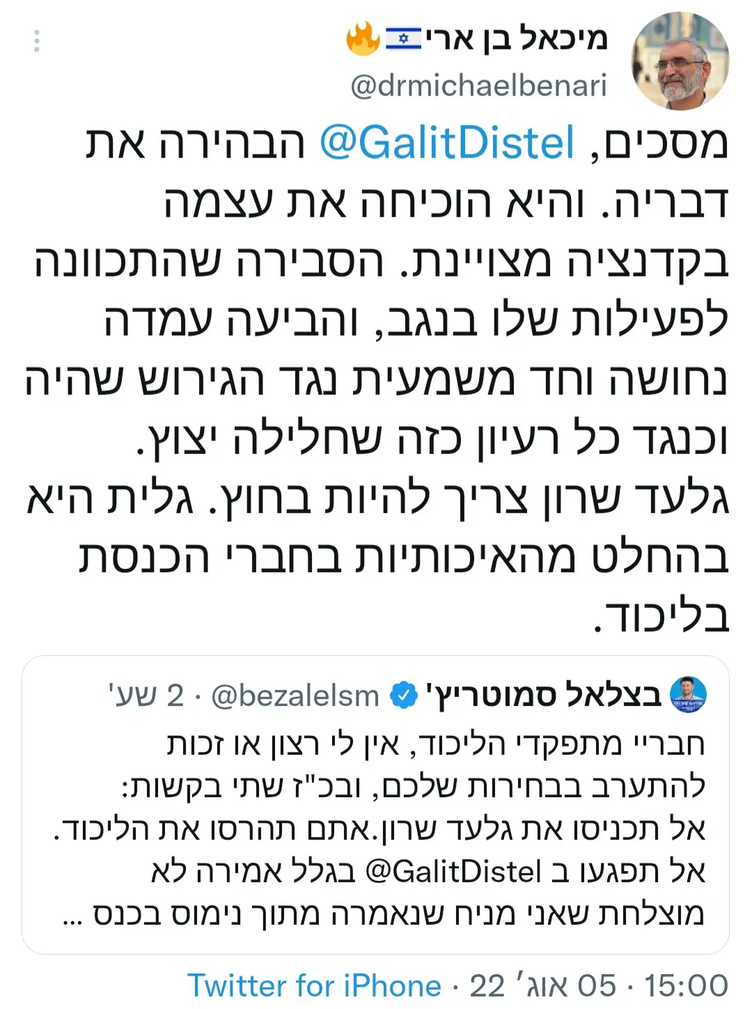 דיסטל-אטבריאן תחת סימן שאלה לאחר הפרסום של עמיאל ירחי בכיפה עם דברים שאמרה על גלעד שרון (מבחינתי קו אדום בוהק). אבל דברים שכתבו מאז מיכאל בן ארי, בצלאל סמוטריץ' ואחרים (ועוזרה הפרלמנטרי שאנחנו בקשר וכתב לי בפרטי) גורמים לי להרהר בנושא, אז בינתיים היא פה אבל אולי זה ישתנה.