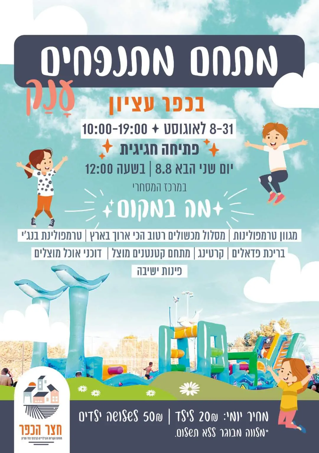 מתחם מתנפחים. 20 ש''ח לילד, הנחה על הילד השלישי.