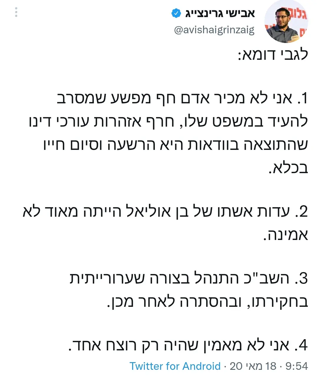פשוט וברור שלולי לילה שלם של עינויים (לא חוקיים) ואיום בהחזרה לעינויים - הוא היה היום אדם חופשי. על הרבה פחות מכך, פושעים גדולים ממשיכים להסתובב ולפגוע.
