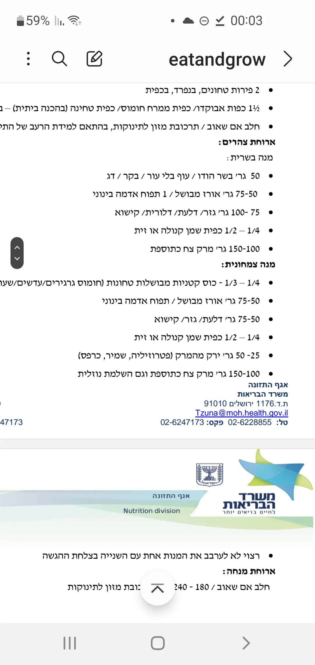 הנה לדוגמא צילום מסך מהמלצות תזונה של משרד הבריאות לתינוקות, יש שם שני פירות, תוספת שומנים והשלמה של בקבוק