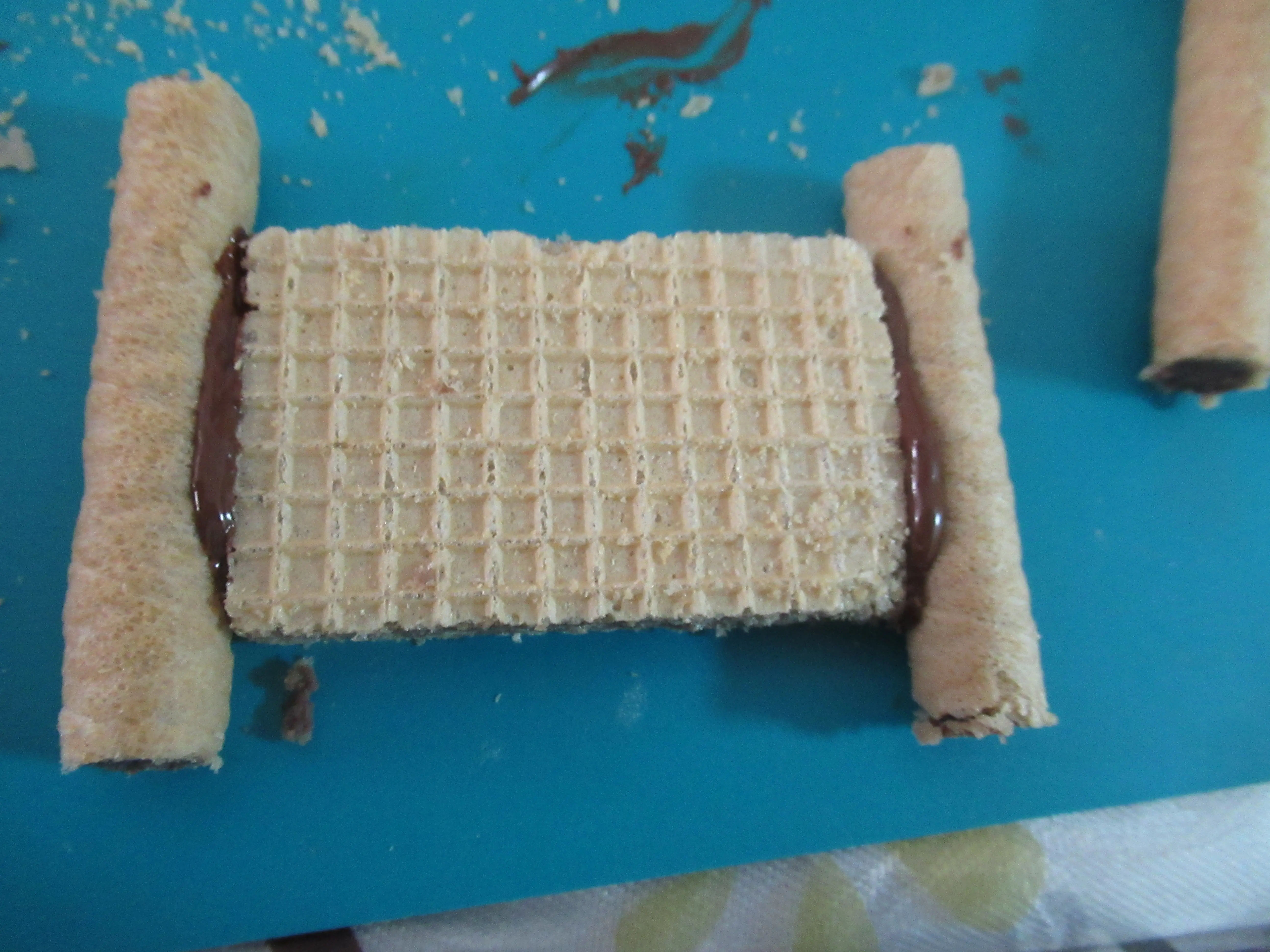 ביסקוויט באמצע ומשני צדדיו שתי גליליות.(מדביקים עם ממרח או קרם שוקולד)
