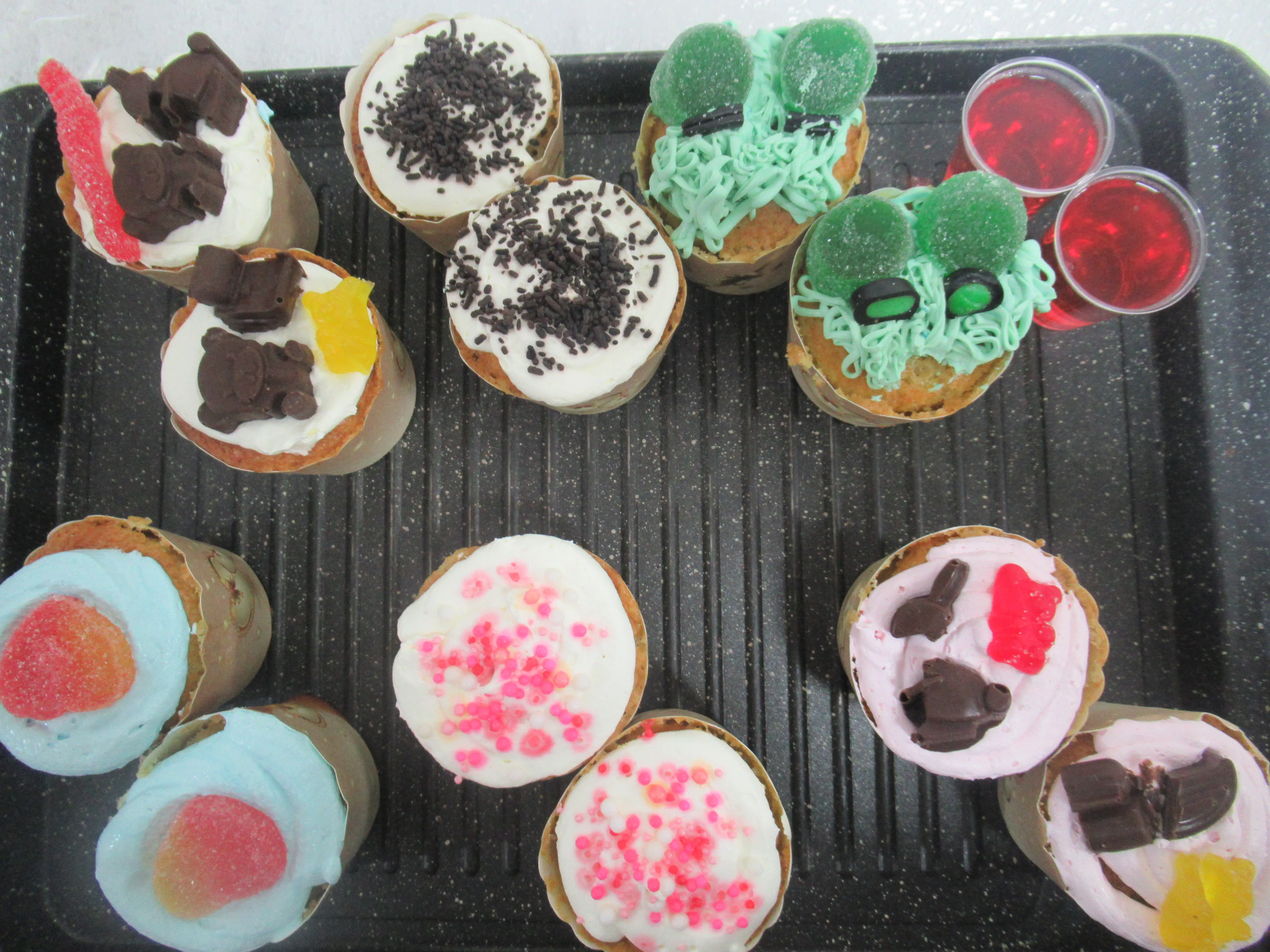 כינים- מאפינס עם קצפת ומעליה סוכריות שוקולד לעוגה