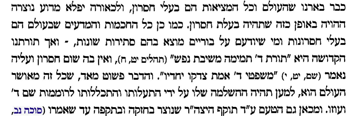 אז דבר ראשון באמת אפשר לשאול האם ניסינו להיות שלמים, פשוט שמחים בחלקנו, בטוב וברע, ולהרגיש הקב"ה נותן לנו כל מה שאנחנו צריכים? אבל לא לזה התכוונתי, התכוונתי לשאול האם מה שאי-אפשר ליצור קשר בלי חיסרון, זה מחויב המציאות, או בסה"כ מגבלות קוגנטיביות שאפשר לשנות? את דעתי בנושא אמרתי.