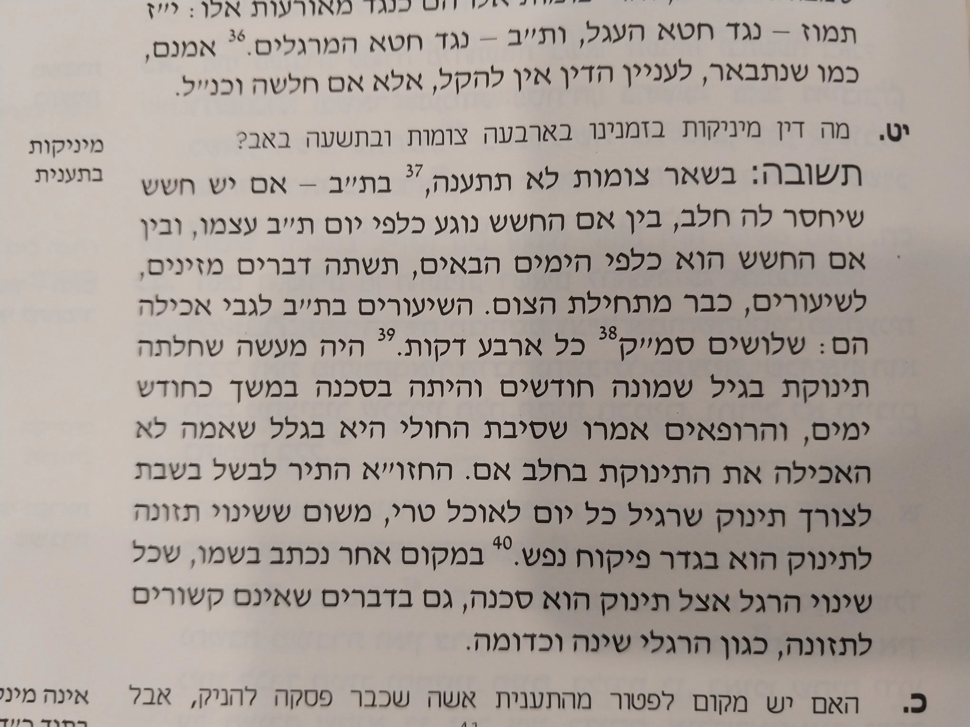 לשיטתו, לא משנים תזונה של תינוק כי זה בגדר פיקוח נפש. ולכן גם תינוק שיונק פעם אחת ביום, לא לוקחים סיכון שיגמר לאמא החלב ולכן האמא שותה לשיעורים (כן כן, גם בתשעה באב).