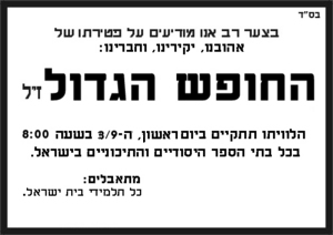 הלוויתו תתקיים ביום רביעי 1/9/04 (07 כבר) בשעה 8:10 בכל בתי הספר היסודיים והתיכוניים בישראל.