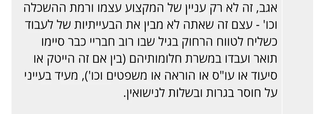 אם שוב תנסה לשכנע אותי ש99 אחוז מהשליחים הם בשנה הראשונה של הטכניון, זה מראה עד כמה אתה קורא את המציאות לפי אידאולוגיה ורגשות ולא לפי עובדות. חצי מאיתנו מתחילים לימודים לתואר ראשון, ולכן יש חצי שני ועוד הרבה אנשים שלא מסיימים את התואר.