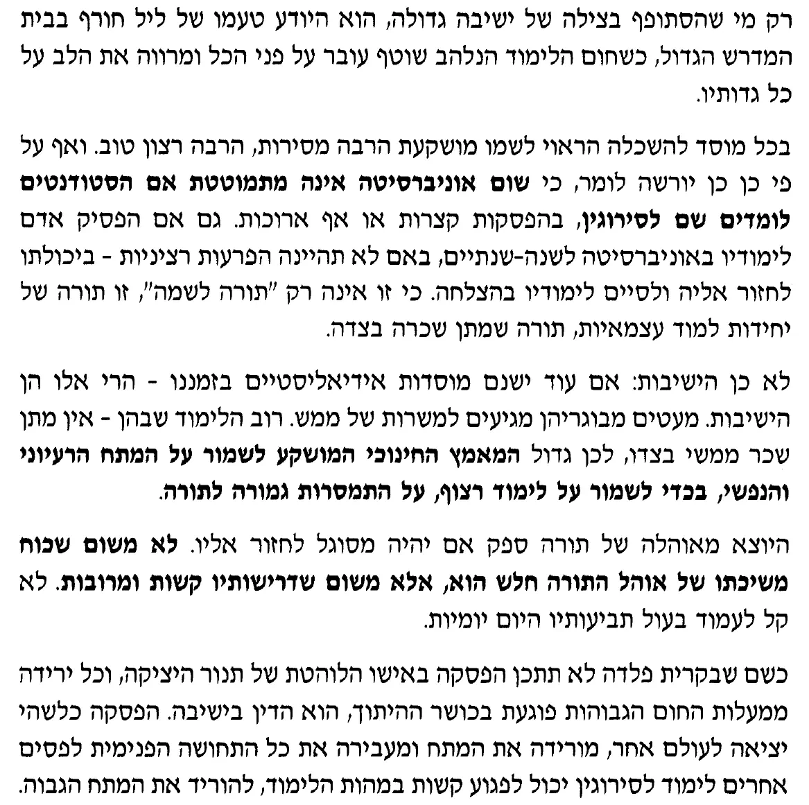 ובסופו־של־דבר יש כאן גם סולם ערכים שונה לדעתי, אם הדבר הכי חשוב בעולם זה התורה ולימודה אז חובה עד כמה שניתן להקים עוד ועוד ישיבות וגם הציבור צריך להירתם לזה בכל־כחו