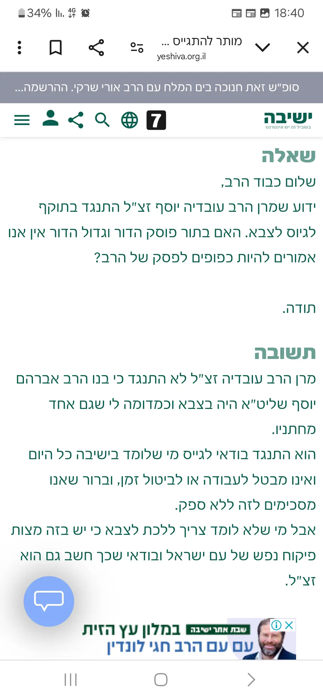 אין קשר בין דעתו העקומה של הרב על גיוס לפסיקות בנוגע לשבת כשרות וחגי ישראל.