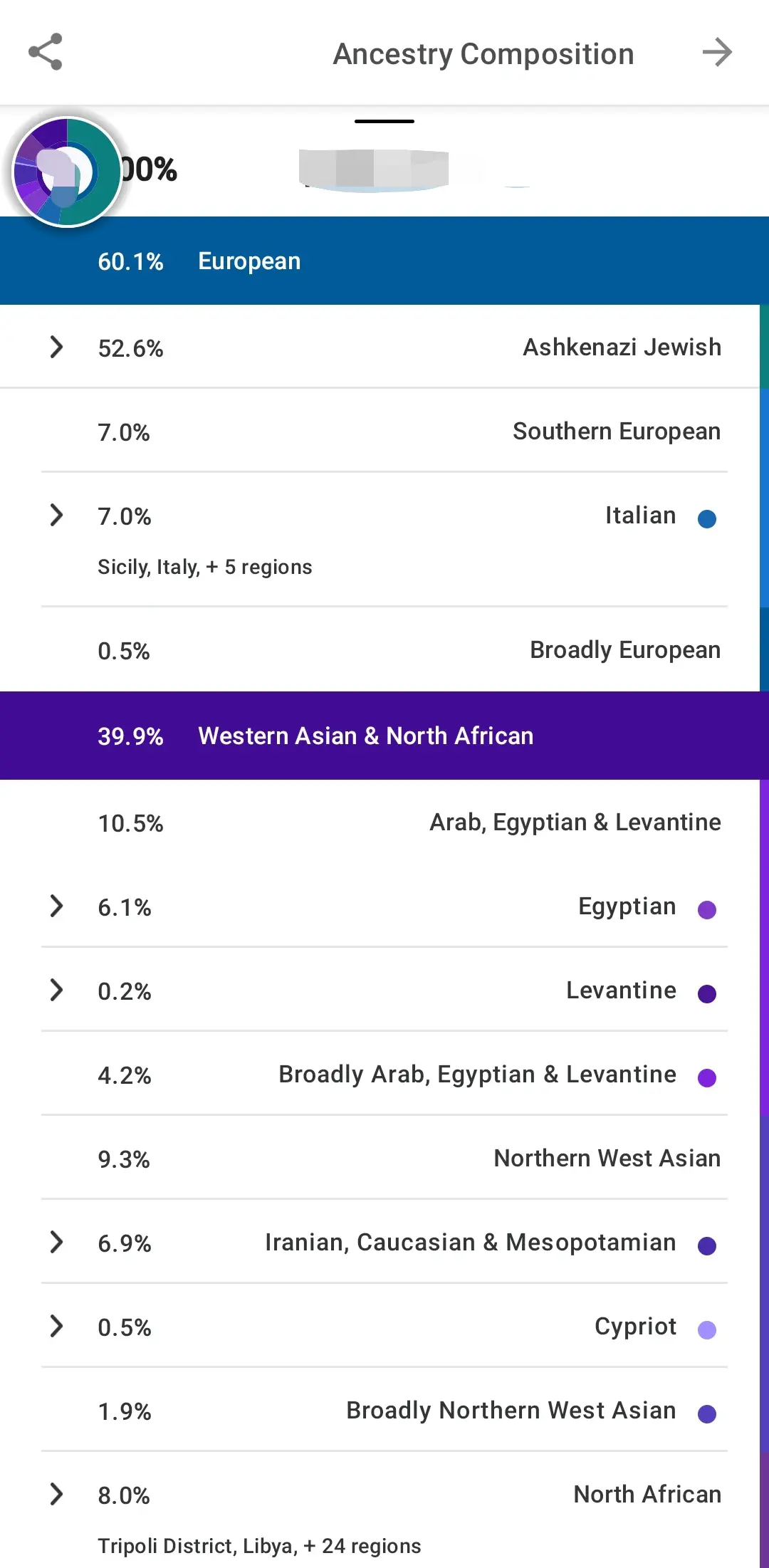 קודם כל ברור שאני יהודי. אני חצי אשכנזי וחצי מזרחי. בבדיקה ב23andme רואים בבירור 50% Ashkenazi jew מובהק. החצי השני, כלומר הגנים התוניסאיים שלי - בלאגן שלם, אבל לדעתי זה רק בגלל שהחברה של 23andme לא למדו טוב את הרצף הגנטי של יהדות צפון אפריקה (שהושפעה מהערבים למרות שרוב הזמן היתה בכלל בספרד, ועדיין המטען הגנטי שלה הוא בעיקר יהודי-כנעני)