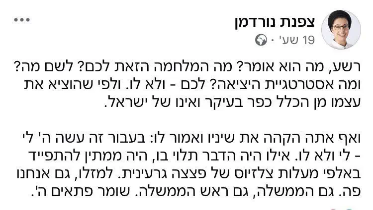 תחשוב על חמאס והטבח בתחילת המלחמה שאילו היינו יוצאים למלחמת מנע התוצאות היו אחרות, אז גם כאן, לחכות היה הרסני.