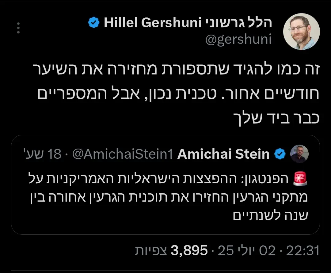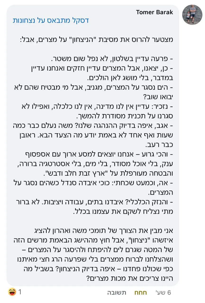 מחילה, אתה מדבר כל היום על 'קפלניסטים' ומגדיר כל מי שבפרומיל לא מוצא חן בעינך כ'קפלניסט', אבל אתה נופל באותו מקום בדיוק. בדיוק השיח של "לעשות הכל כדי להחזיר אותם" - הוא השיח שגרם שלמרות הישגים מדהימים שלנו במלחמה, החמאס עדיין קיים ושולט בחלק מהרצועה.