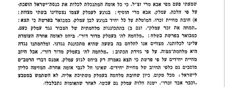 "However, the obligation to wipe out individual Amalekites, as set forth in the verse from Deuteronomy, applies only to genealogical descendants of Amalek. Now it is true that Maimonides' ruling also includes the obligation to blot out individuals, an obligation which does not apply to any nation other than Amalek, even if that nation seeks to destroy the Jewish people"