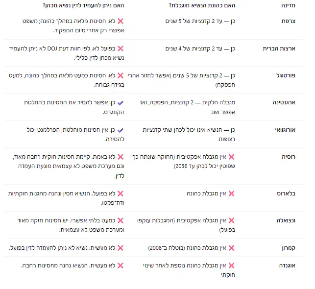 וביקשתי שליד כל מדינה יכתוב האם הכהונה מוגבלת והאם מותר להעמיד לדין בזמן הכהונה: