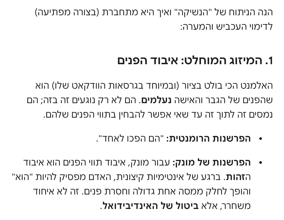 דווקא המפגש פנים אל פנים יוצר זוגיות. של 1+1=3. "והיו לבשר אחד". איש+אשה=הזוג/הסינתזה ביניהם/הילד