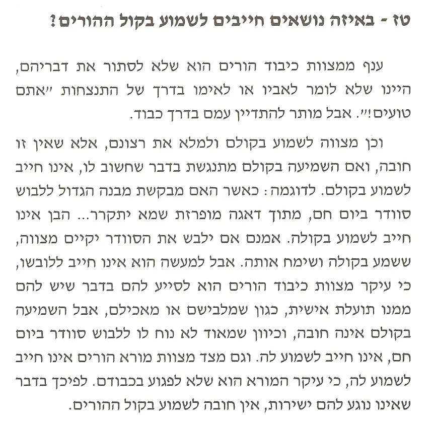 כמו שלא צריך להקשיב להורים האם להיות רופא או רועה צאן לא צריך להקש/יב להם אלא בדברים שנוגעים להם לדוגמא: אם הם אומרים לך להוריד את הזבל אתה חייב אבל לא האם ללכת למאחז או לא