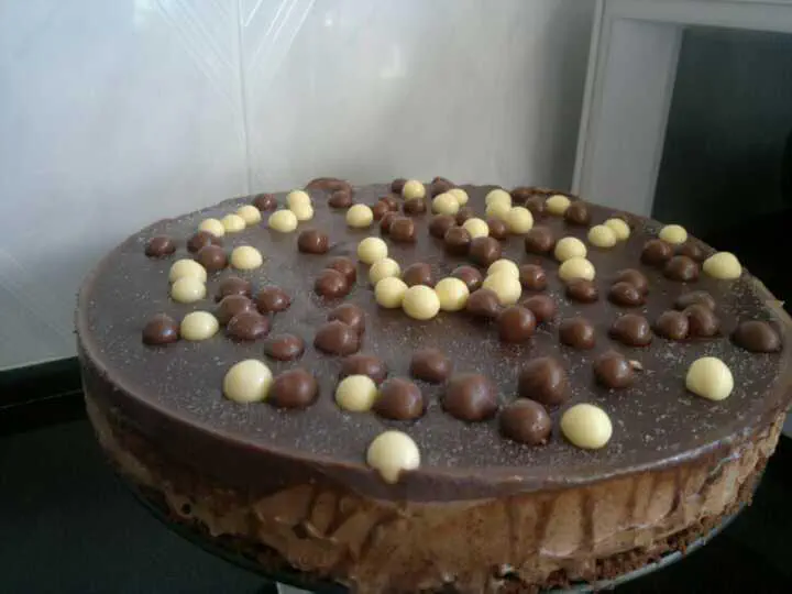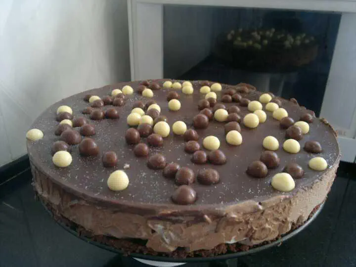 4. להמיס שוקולד ושמנת לקרם אחיד ולצקת על שכבת השוקולד, להקפיא ללילה ולהפשיר במקרר כשעתיים לפני ההגשה.