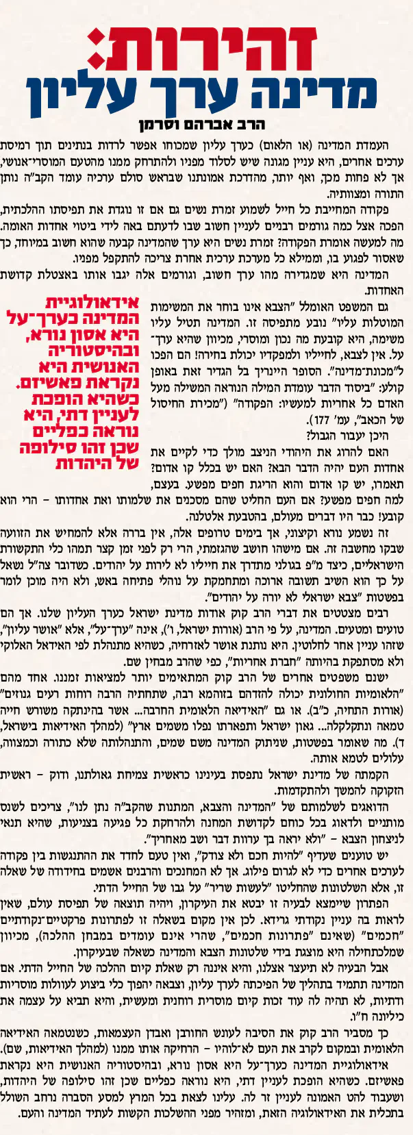 אין חדש תחת השמש. כלומר: אין טענות שלא התלבנו ונטחנו עד דק. כיון שכך, אין טעם להתחיל לטחון שוב את הטענות, ורק אפנה למאמרו החשוב של הרב אברהם וסרמן בעולם קטן של השבת, "זהירות: מדינה ערך עליון" כותרתו, וכן אנגע בכמה נקודות סביב החוברת ובשורשה: