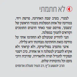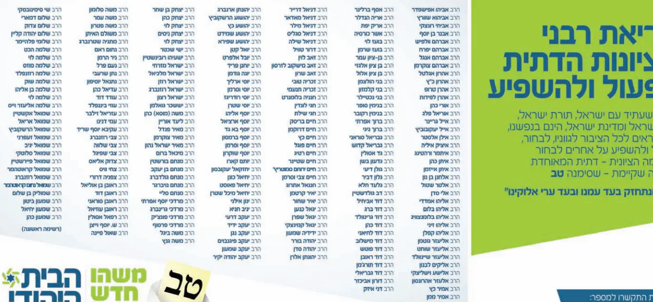 השבת פורסמה פרסומת בדף הראשון של העיתון בשבע שבה שמות של עשרות רבנים התומכים בבית היהודי. בין הרבנים ששמם הוםיע ברשימה היה הרב ינון אילני, ראש ישיבת חן במדבר בעיר ערד ומלמד מידי שבוע בימי חמישי בישיבות חומש ושבי שומרון.