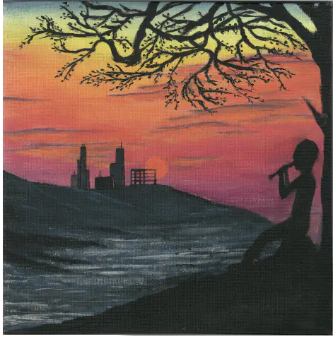 באופק רואים גורדי שחקים, אך הם בודדים ואחדים. זה נותן תחושה של- אולי הכל שמה סואן ומלא חיים, אך בעצם זה ריק ומת? |נקודה למחשבה| והאיש שלנו יושב תחת העץ, על אבן, מנגן וצופה לו על בועת החיים הרחוקה ההיא...