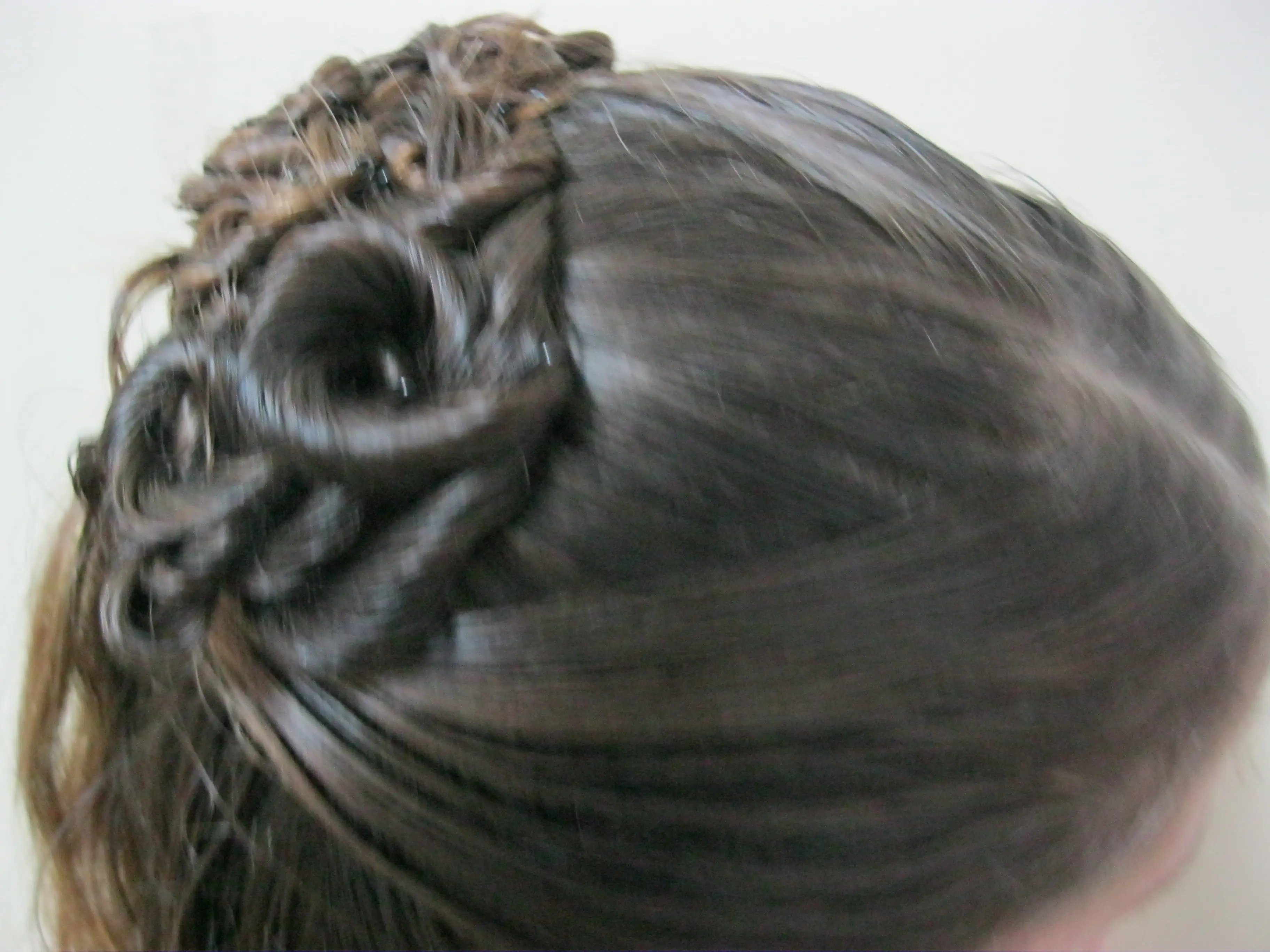 ) מסביב לראש. הפעם לוקחים מהצד החיצוני את ה"שאריות" מהעיגול ומהצד הפנימי לוקחים כל פעם פיסות שוות וקטנות מהשיער שבקוקו) כשנגמר השיער ממשיכים לקלוע עד הסוף, וסוגרים בגומייה. את הצמה מכניסים לתוך ה"כיפה" שנוצרה ומחזקים עם סיכות.