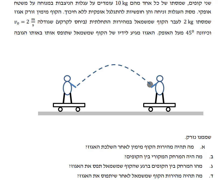 ד. אני חושב שהתשובה פשוט צריכה להיות שהמהירות היא בדיוק כמו של הקוף מימין, רק בכיוון השני. וזה בגלל שאם מתחשבים רק בציר אחד, אז האנרגיה שקוף א' קיבל בזריקת הכדור, היא בדיוק האנרגיה שהכדור העביר לקוף שתפס אותו. ומכיון שהמסה של הקוף הראשון והשני היא אותה מסה -המהירות תהיה אותה מהירות.