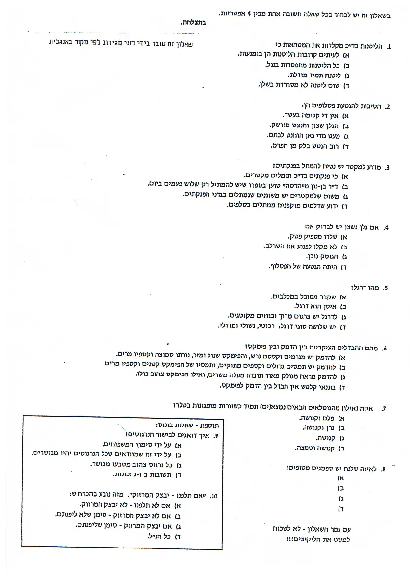 שאלה 9: תשובה ב' אינה עונה על השאלה(אלא חוזרת על אותו הדבר במילים אחרות), תשובה ג' לא עונה על השאלה, אך כאילו טוענת שהשאלה אינה צריכה להישאל מלכתחילא. אולם תשובה זו מדברת על סוג מסוים של נרגוסים, כאשר השאלה דיברה באופן כללי. נשארת רק תשובה א'.