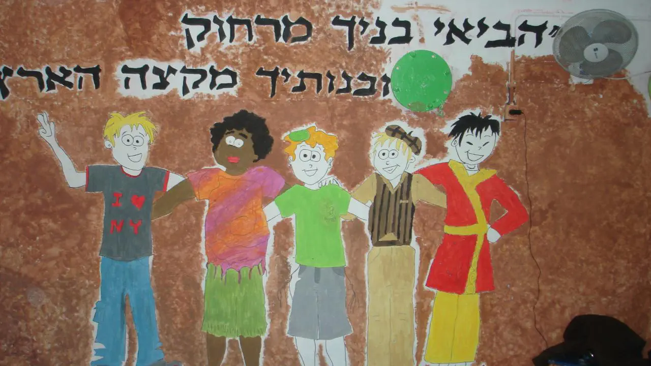 בקיר נושא עושים "הביא בניין מרחוק ומבנותייך מקצה הארץ" עם כל מיני סוגיי עולים (אתיופים רוסים וכו..)