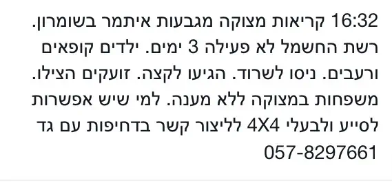 שבוע טוב לכולם, עכשיו הצלחתי להטעין את הפלאפון קצת במטען של הרכב, (מזל שהמצבר עדיין עובד) כמעט אין קליטה במכשירי הסלולר ואין תקשורת עם העולם שלא נדבר על תקשורת בין התושבים למקרה חירום, כל אחד בכוחות עצמו, המצב הוא שעדיין עד רגע זה אנחנו בלי חשמל מיום חמישי בלילה בשעה 12 זה אומר עוד מעט 48 שעות ללא חשמל ואי אפשר לדעת גם מתי החשמל יחזור, במהלך ליל שבת המשיך השלג לרדת ללא הפסקה והגיע לגובה של 1 מטר, בבוקר שבת הייתה הפוגה בשלגים אך בשבת בצהרים המשיך השלג לרדת, תוך כדי התחדשות השלג הגיע מסוק של חיל האוויר לפנות יולדת לבית חולים, במקביל לפינוי החלו ערבים לעלות לכיוון הישוב מכיוון הכפרים הסובבים את הישוב כיתת הכוננות הניסה אותם, אנחנו בבית ישנו בסלון והתחממנו רק ע''י הגז שבכיריים, לבושים ב 4 שכבות של בגדים ובחוץ בלילה מינוס 1 מעלות לפי המד מעלות, המקרר והמקפיא כבר הפסיקו את פעולתם ביום חמישי בלילה אז בליל שבת אחרי הסעודה הוצאנו על אדן החלון את הדברים שצריכים מקרר, וקברנו בשלג את הדברים שצריכים מקפיא, כמובן שאין מים חמים מיום חמישי כי אין חשמל, אז אין לנו את הפריוולגיה להתקלח, חזרנו 100 שנה אחורה ואנו חווים את התחושה כמה קשה לחיות ללא חשמל, מרגישים כאילו חיים באיזה סרט שמתאר את סוף העולם כאשר הכל עוצר מלכת ונקפא, ולא יודעים מה ילד יום, חוששים שהמזון יגמר שהלהבות בגז ידעכו, ואז גם טיפת החום האחרונה תיהיה חום גופנו, וכך אנו מוצאים את עצמנו יושבים כל המשפחה מתכרבלים בשמיחות ומנסים לשמור על המורל ולא להעביר לילדים את תחושת הפחד מהבלתי נודע, (תזכרו טוב את התאריך שבו השלג התחיל 13\12\12 ערב עשרה בטבת, התאריך הזה יכנס להיסטוריה) כל הישובים בסביבה עדין נצורים אין יוצא ואין בא, הכבישים עם שלג בגובה 60-70 ס''מ, ולא ניתן לפנות כרגע את השלג במקביל בכל הישובים, כי אין מספיק כלים כבדים לפינוי הצירים, מקווים שעד יום שני החשמל יחזור ונוכל להתחיל לנוע בכביש ולחזור לשגרה, כי לפי מה שאנו מבינים החשמל נפל בחלקים גדולים מהארץ ואנו באזור בעדיפות פחות חשובה ביחס לכמות התושבים הגרים בערים הגדולות ששם אין חשמל ''מקווים שאתם מחזיקים לנו אצבעות כי אנחנו לא מצליחים להחזיק אותם מרוב קור''