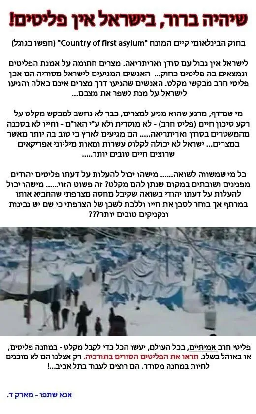 שמעת על מחנות העבודה בסין? חביבה, ארץ ישראל היא לא הסופרמן של העולם, ומדינה קטנה בעלת צבא קטן לא ממש יכולה לדאוג לכל העולם כשהיא עצמה נמצאת בסכנה. זה מוזר, כי זה אמור להיות מובן מאיליו. והוכח ע"פ אנשים שזה המקצוע שלהם, שהם מהגרי עבודה ולא פליטים, הסיפור על סבתא ממש מרגש, במיוחד שהוא חל גם עליי בשינוי כמה פרטים, אבל הוא לא מוכיח דבר וחצי דבר על הסודאנים, שגם אם יש בינהם פליטים, הרי שהרוב הם מהגרי עבודה.