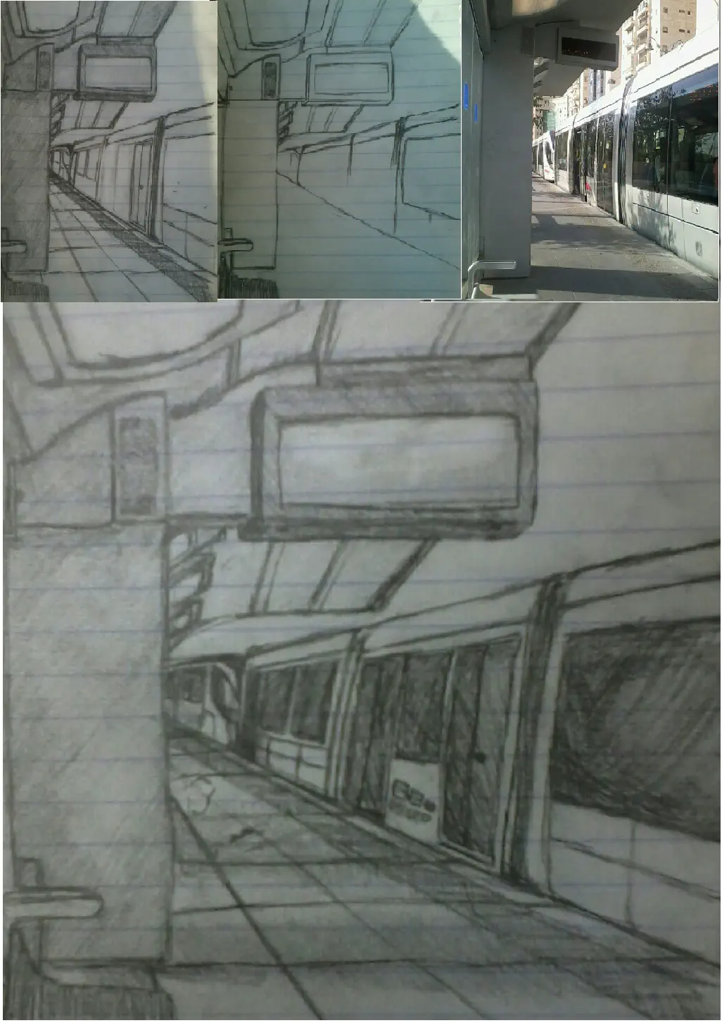התחנה את התחנה ציירתי מזווית הראיה שלי, את הרכבת - מהזווית של הפלאפון. הזוויות שונות.