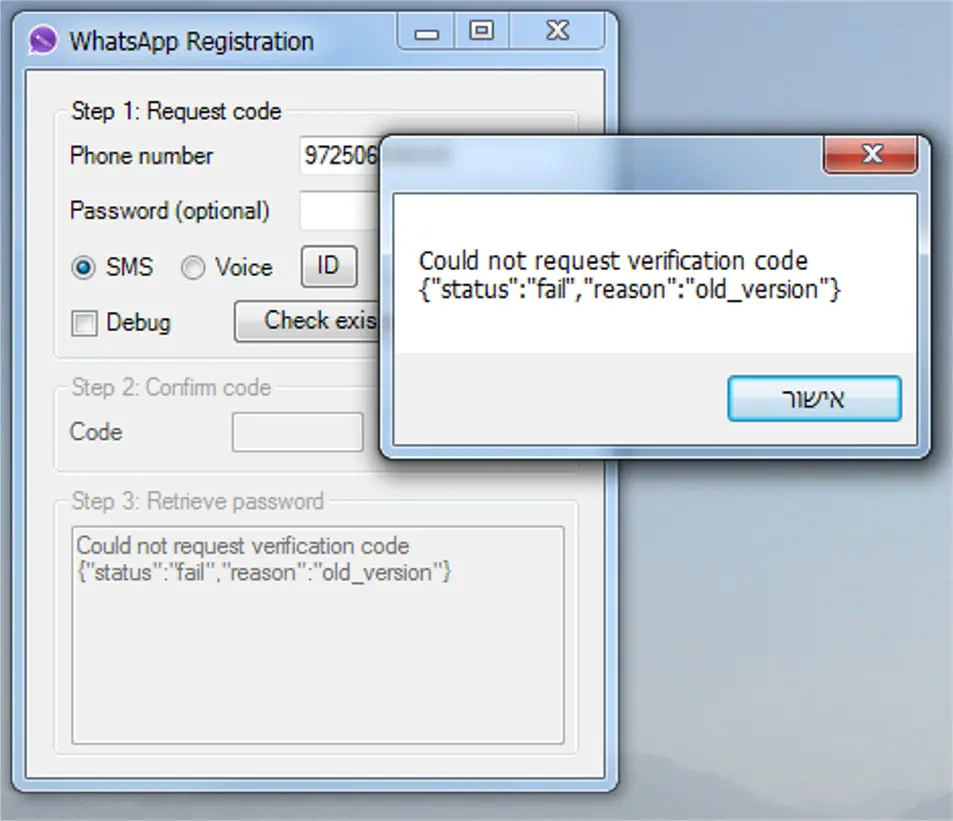 וחזרו לwassapp הדביקו את זה בpassword, וtelephone number כתבו את המספר שלכם באותה צורה כמו שכתבתם בתוכנה השנייה (רק שעכשיו 972 מופיע אז כתבו את המספר שלכם פשוט בלי ה0 בהתחלה לדוג': 503334456)